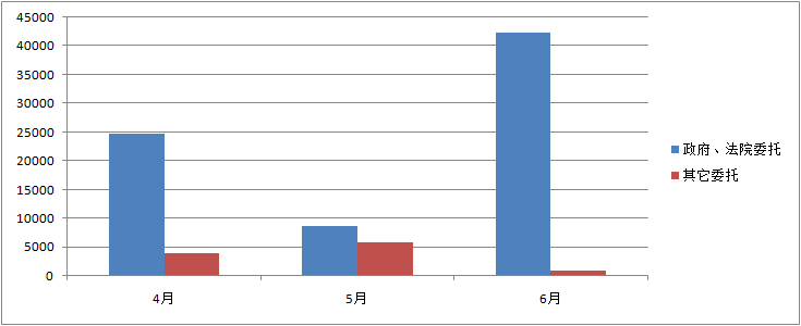 4月和6月政府、法院委托成交額仍然是主要來源,5月份其他社會委托出現(xiàn)增長。