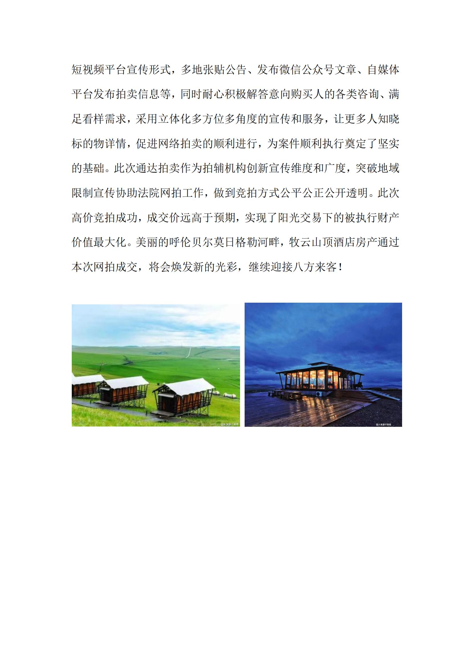 專業(yè)拍賣機(jī)構(gòu),助力司法拍賣 我區(qū)拍賣企業(yè)開(kāi)始入圍法院司輔機(jī)構(gòu)已經(jīng)兩年有余,在入圍的這兩年多時(shí)間里,拍賣企業(yè)作為專業(yè)的拍賣機(jī)構(gòu)不斷的完善自身,利用我們的專業(yè)助力司法拍賣,提高司法拍賣的成交額。拍賣企業(yè)的專業(yè)就是拍賣,作為司法輔助機(jī)構(gòu),我們拍賣企業(yè)更能夠從委托方角度出發(fā),從標(biāo)的角度出發(fā),從競(jìng)買人的角度出發(fā),深刻的了解各方的切實(shí)需求。也更可以找到標(biāo)的的亮點(diǎn)從而非常專業(yè)的對(duì)其進(jìn)行宣傳,通過(guò)拍賣企業(yè)本身的客戶資源以及通過(guò)網(wǎng)站、公眾號(hào)、宣傳視頻等多種新的宣傳自媒體齊發(fā)力,已經(jīng)突破了地域限制,使得更多的潛在買家可以看到和了解標(biāo)的。同時(shí)專業(yè)的拍賣公司有著強(qiáng)大的拍賣實(shí)力和風(fēng)控能力,對(duì)于拍賣過(guò)程中出現(xiàn)的問(wèn)題以及未出現(xiàn)的問(wèn)題都會(huì)做到提前準(zhǔn)備預(yù)案,這樣為標(biāo)的的最后成交奠定了專業(yè)而扎實(shí)的基礎(chǔ)。因?yàn)樾g(shù)業(yè)有專攻,讓專業(yè)的人做專業(yè)的事更能讓他們發(fā)揮所長(zhǎng),讓價(jià)值得到最大化,也能盡快的找到解決辦法,從而節(jié)省成本。 昨天收到來(lái)自內(nèi)蒙古通達(dá)拍賣有限責(zé)任公司的好消息,位于呼倫貝爾草原“打卡”標(biāo)志地的“牧云山頂酒店”房產(chǎn)網(wǎng)絡(luò)司法拍賣通過(guò)該企業(yè)的輔助宣傳,網(wǎng)絡(luò)拍賣產(chǎn)生了激烈的競(jìng)價(jià),經(jīng)過(guò)277 輪競(jìng)價(jià)后,最終以 20,627,063 元成交,溢價(jià)率達(dá)到 499%。 這便是一個(gè)很好的例子,希望我們?nèi)珔^(qū)的拍賣企業(yè)都能充分發(fā)揮自身專業(yè)優(yōu)勢(shì),助力司法拍賣,在這一領(lǐng)域開(kāi)疆?dāng)U土,以此為契機(jī),從點(diǎn)到線再到面的全面發(fā)展。